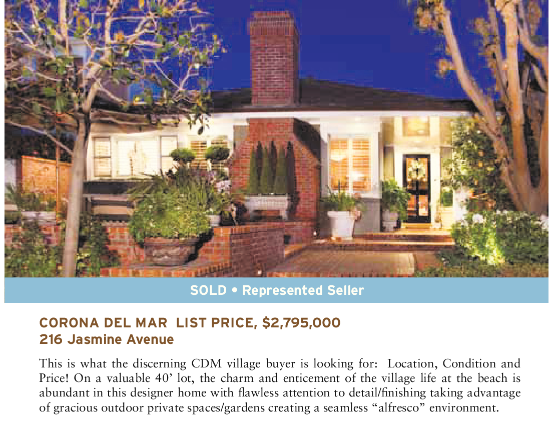 SOLD • Represented Seller CORONA DEL MAR LIST PRICE, $2,795,000 216 Jasmine Avenue This is what the discerning CDM village buyer is looking for: Location, Condition and Price! On a valuable 40’ lot, the charm and enticement of the village life at the beach is abundant in this designer home with flawless attention to detail/finishing taking advantage of gracious outdoor private spaces/gardens creating a seamless “alfresco” environment.
