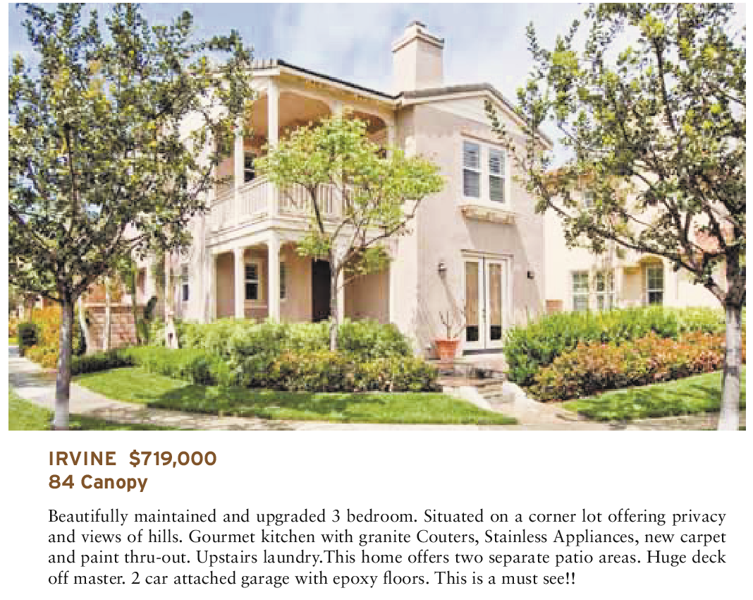 IRVINE $719,000 84 Canopy Beautifully maintained and upgraded 3 bedroom. Situated on a corner lot offering privacy and views of hills. Gourmet kitchen with granite Couters, Stainless Appliances, new carpet and paint thru-out. Upstairs laundry.This home offers two separate patio areas. Huge deck off master. 2 car attached garage with epoxy floors. This is a must see!!