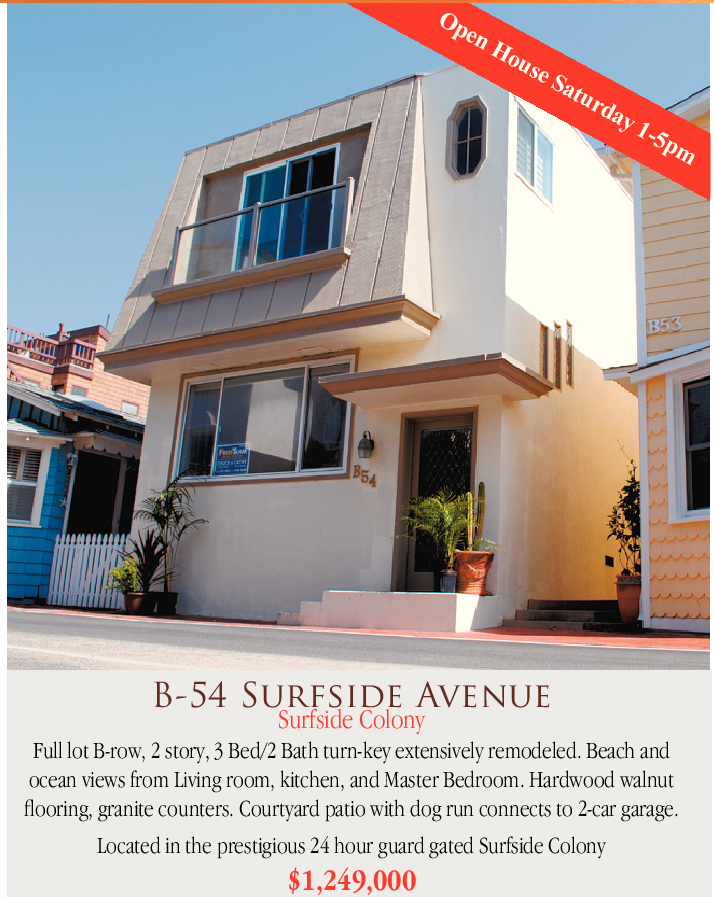 B-54 Surfside Avenue Surfside Colony Full lot B-row, 2 story, 3 Bed/2 Bath turn-key extensively remodeled. Beach and ocean views from Living room, kitchen, and Master Bedroom. Hardwood walnut flooring, granite counters. Courtyard patio with dog run connects to 2-car garage.
