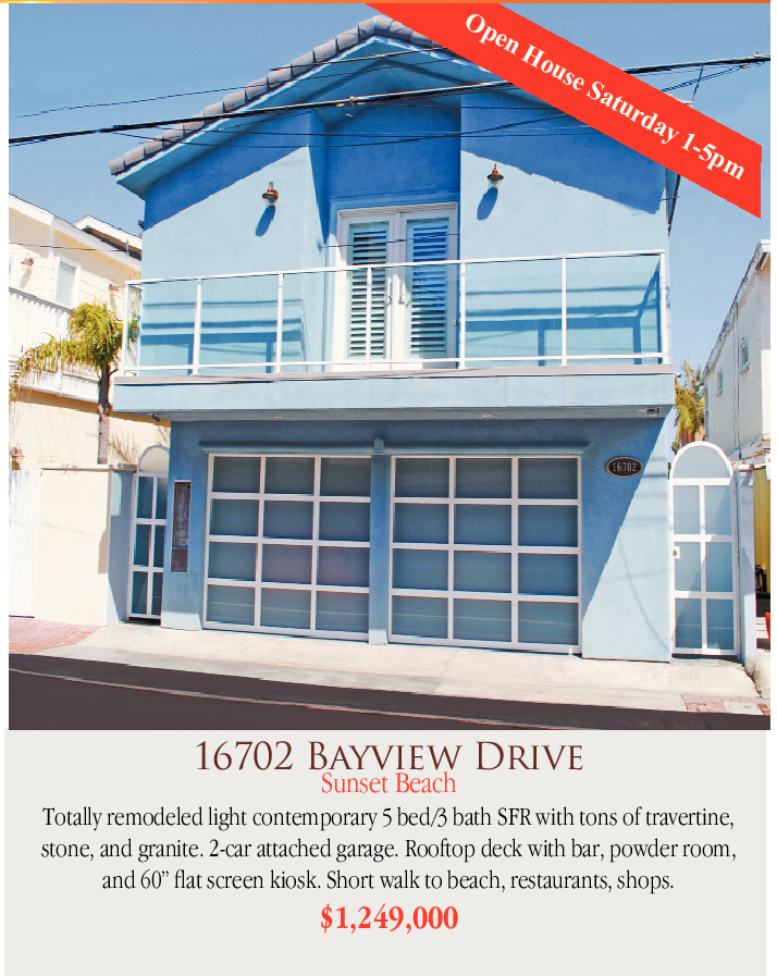 16702 Bayview Drive Sunset Beach Totally remodeled light contemporary 5 bed/3 bath SFR with tons of travertine, stone, and granite. 2-car attached garage. Rooftop deck with bar, powder room, and 60” flat screen kiosk. Short walk to beach, restaurants, shops.