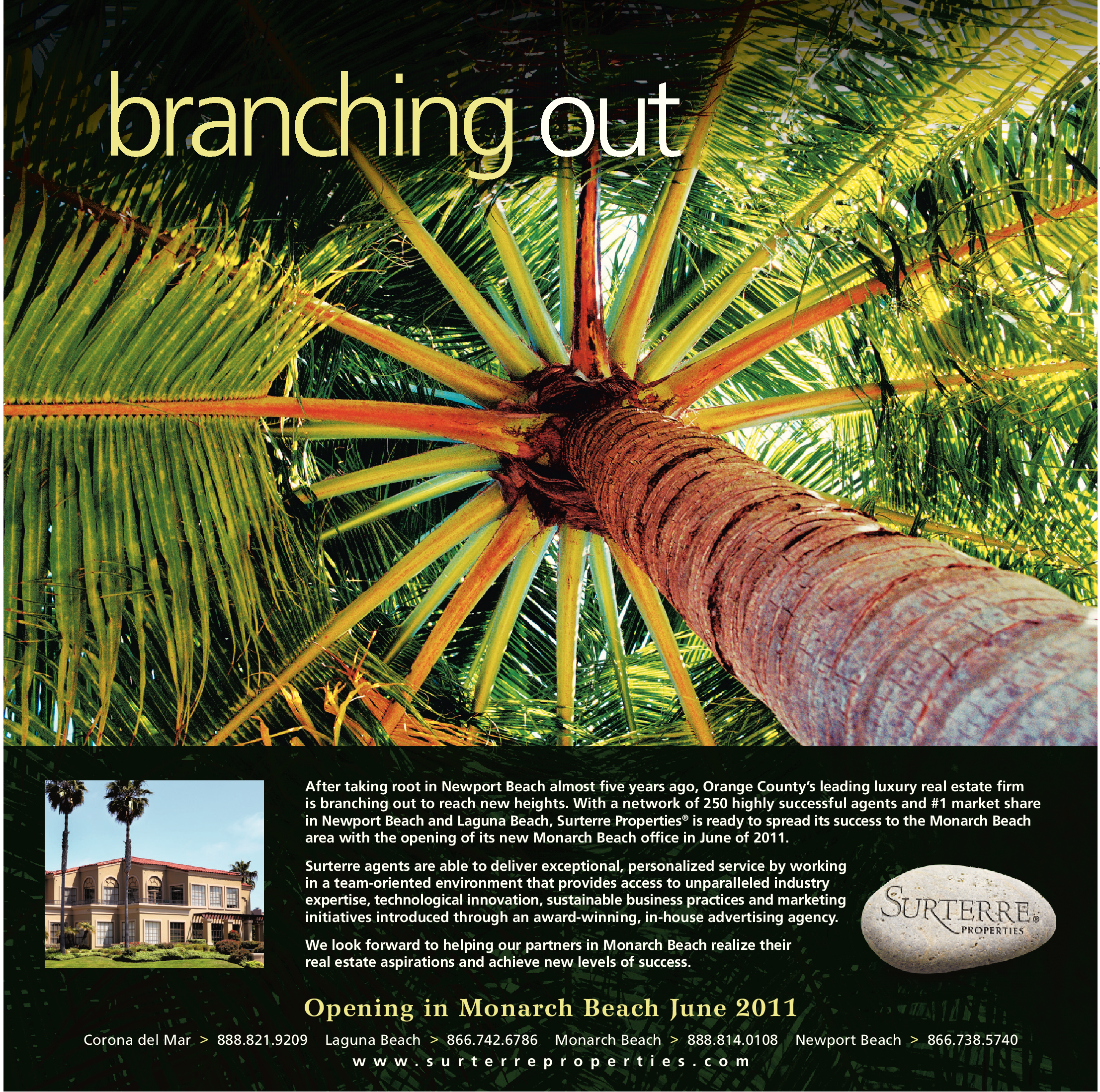 After taking root in Newport Beach almost five years ago, Orange County’s leading luxury real estate firm is branching out to reach new heights. With a network of 250 highly successful agents and #1 market share in Newport Beach and Laguna Beach, Surterre Properties ® is ready to spread its success to the Monarch Beach area with the opening of its new Monarch Beach office in June of 2011.