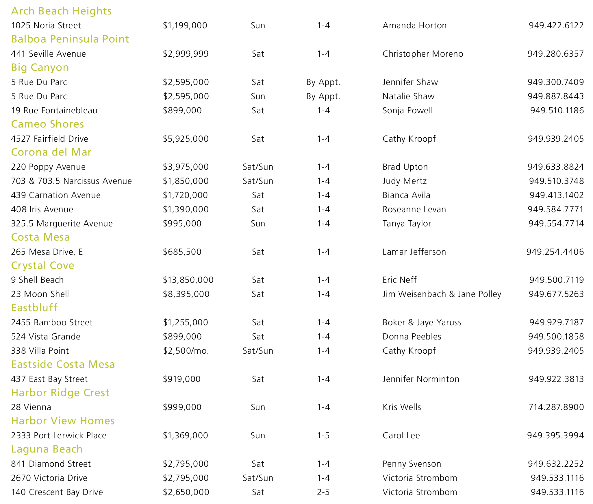 5 Rue Du Parc $2,595,000 Sat By Appt. Jennifer Shaw 949.300.7409 5 Rue Du Parc $2,595,000 Sun By Appt. Natalie Shaw 949.887.8443 19 Rue Fontainebleau $899,000 Sat 1-4 Sonja Powell 949.510.1186 Cameo Shores 4527 Fairfield Drive $5,925,000 Sat 1-4 Cathy Kroopf 949.939.2405 Corona del Mar 220 Poppy Avenue $3,975,000 Sat/Sun 1-4 Brad Upton 949.633.8824 703 & 703.5 Narcissus Avenue $1,850,000 Sat/Sun 1-4 Judy Mertz 949.510.3748 439 Carnation Avenue $1,720,000 Sat 1-4 Bianca Avila 949.413.1402 408 Iris Avenue $1,390,000 Sat 1-4 Roseanne Levan 949.584.7771 325.5 Marguerite Avenue $995,000 Sun 1-4 Tanya Taylor 949.554.7714 Costa Mesa 265 Mesa Drive, E $685,500 Sat 1-4 Lamar Jefferson 949.254.4406 Crystal Cove 9 Shell Beach $13,850,000 Sat 1-4 Eric Neff 949.500.7119 23 Moon Shell $8,395,000 Sat 1-4 Jim Weisenbach & Jane Polley 949.677.5263 Eastbluff 2455 Bamboo Street $1,255,000 Sat 1-4 Boker & Jaye Yaruss 949.929.7187 524 Vista Grande $899,000 Sat 1-4 Donna Peebles 949.500.1858 338 Villa Point $2,500/mo. Sat/Sun 1-4 Cathy Kroopf 949.939.2405 Eastside Costa Mesa 437 East Bay Street $919,000 Sat 1-4 Jennifer Norminton 949.922.3813 Harbor Ridge Crest 28 Vienna $999,000 Sun 1-4 Kris Wells 714.287.8900 Harbor View Homes 2333 Port Lerwick Place $1,369,000 Sun 1-5 Carol Lee 949.395.3994 Laguna Beach 841 Diamond Street $2,795,000 Sat 1-4 Penny Svenson 949.632.2252 2670 Victoria Drive $2,795,000 Sat/Sun 1-4 Victoria Strombom 949.533.1116 140 Crescent Bay Drive $2,650,000 Sat 2-5 Victoria Strombom 949.533.1116