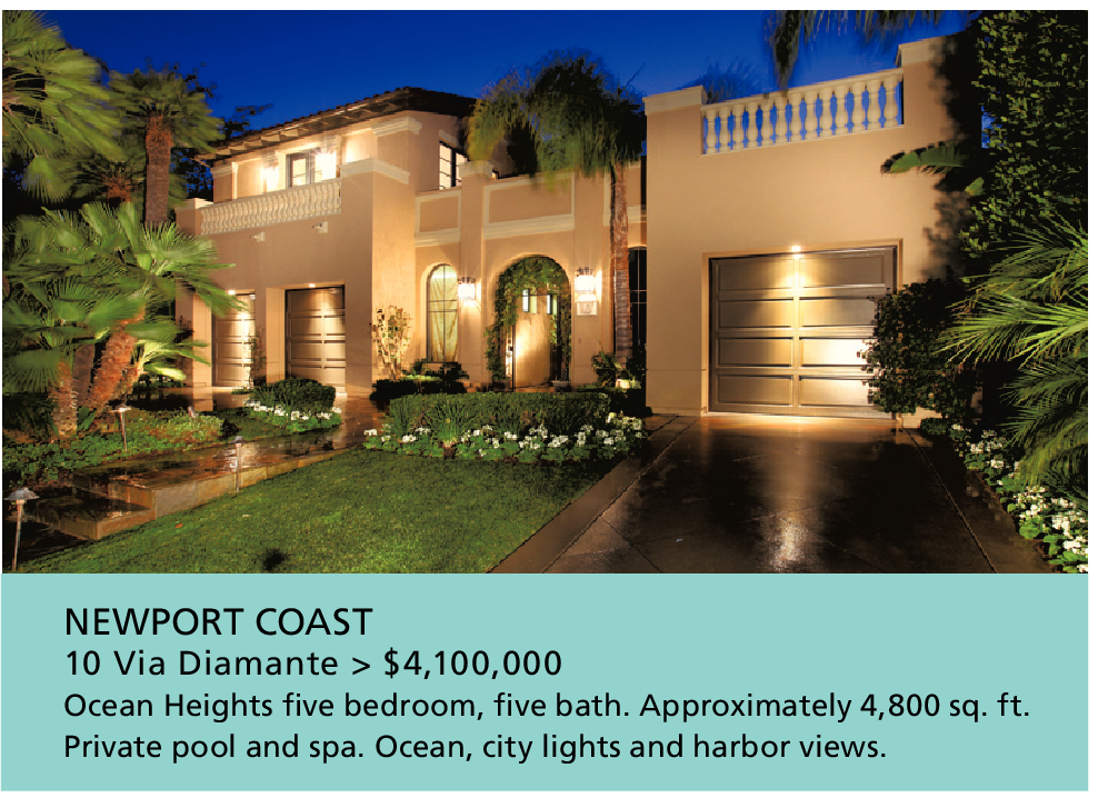 NEWPORT COAST 10 Via Diamante > $4,100,000 Ocean Heights five bedroom, five bath. Approximately 4,800 sq. ft. Private pool and spa. Ocean, city lights and harbor views.