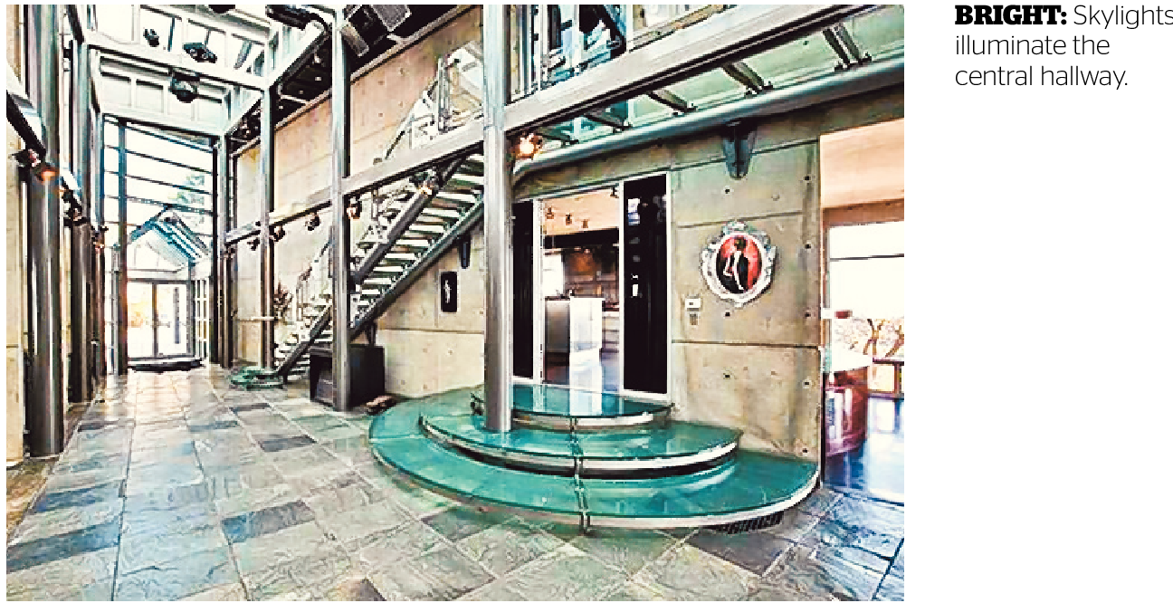 In front, a concrete portico supported by circular steel beams and topped by rows of angled skylights leads to a pair of tall glass doors. A long entry hall that doubles as an art gallery extends almost the entire length of the structure. It has tiled slate floors, poured concrete walls, glass bricks and a frosted glass atrium ceiling some 30 feet high, well above the home’s upper level.