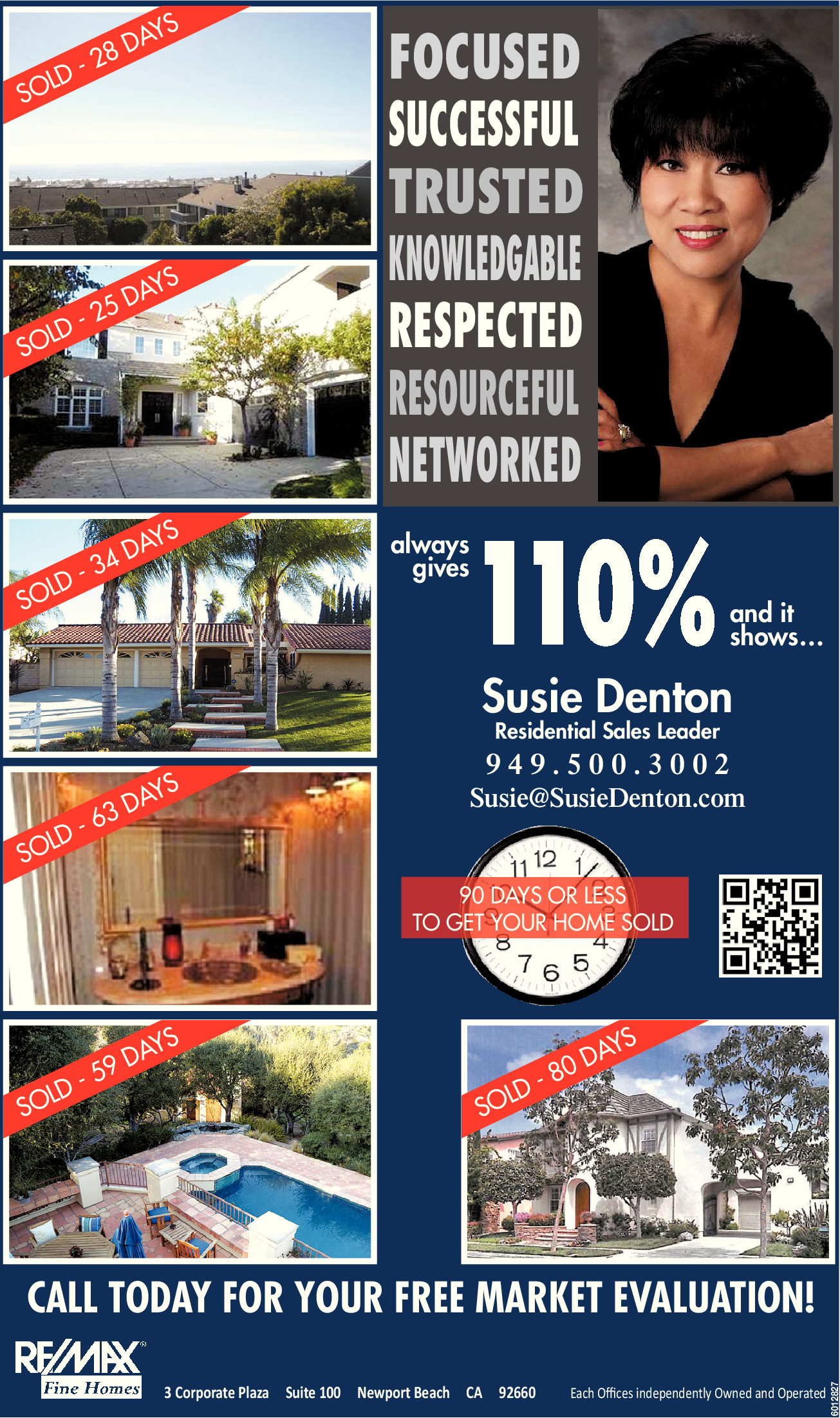 FOCUSED SUCCESSFUL TRUSTED KNOWLEDGABLE RESPECTED RESOURCEFUL NETWORKED always 110% gives Susie Denton Residential Sales Leader 9 4 9 . 5 0 0 . 3 0 0 2 Susie@SusieDenton.com 90 DAYS OR LESS TO GET YOUR HOME SOLD and it shows… CALL TODAY FOR YOUR FREE MARKET EVALUATION! 3 Corporate Plaza Suite 100 Newport Beach CA 92660 Each Offices independently Owned and Operated
