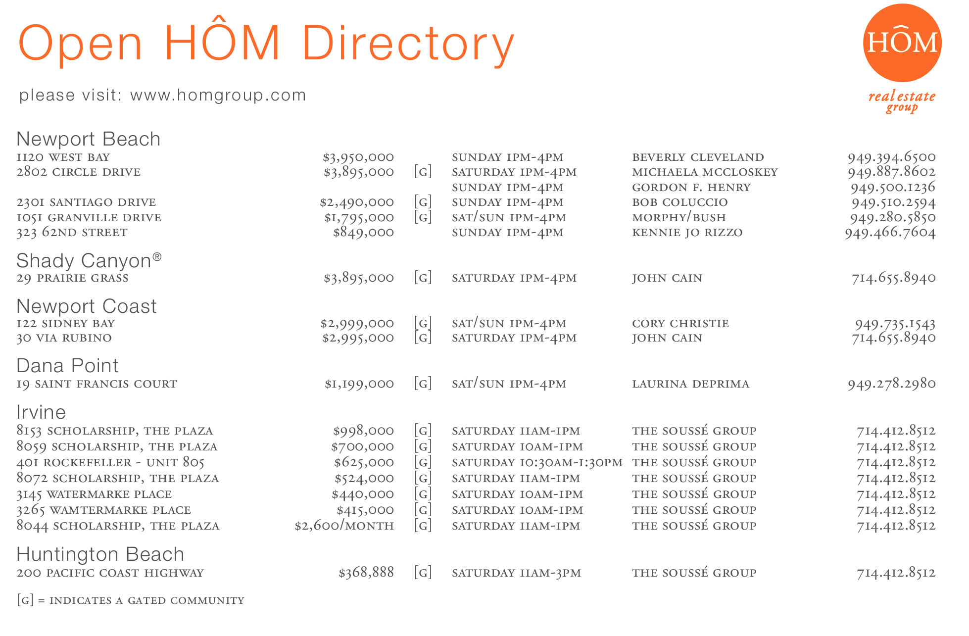 122 sidney bay $2,999,000 [g] sat/sun 1pm-4pm cory christie 949.735.1543 30 via rubino $2,995,000 [g] saturday 1pm-4pm john cain 714.655.8940