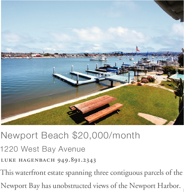 Newport Beach $20,000/month 1220 West Bay Avenue luke hagenbach 949.891.2343 This waterfront estate spanning three contiguous parcels of the Newport Bay has unobstructed views of the Newport Harbor.