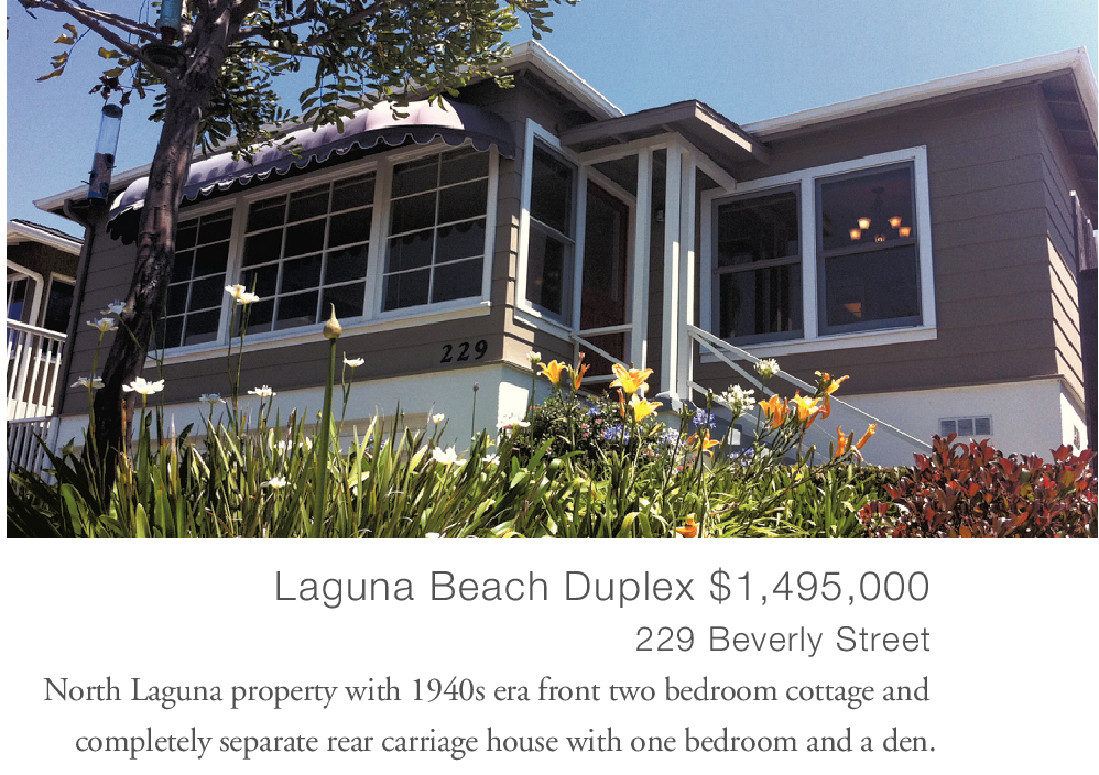 Laguna Beach Duplex $1,495,000 229 Beverly Street North Laguna property with 1940s era front two bedroom cottage and completely separate rear carriage house with one bedroom and a den.