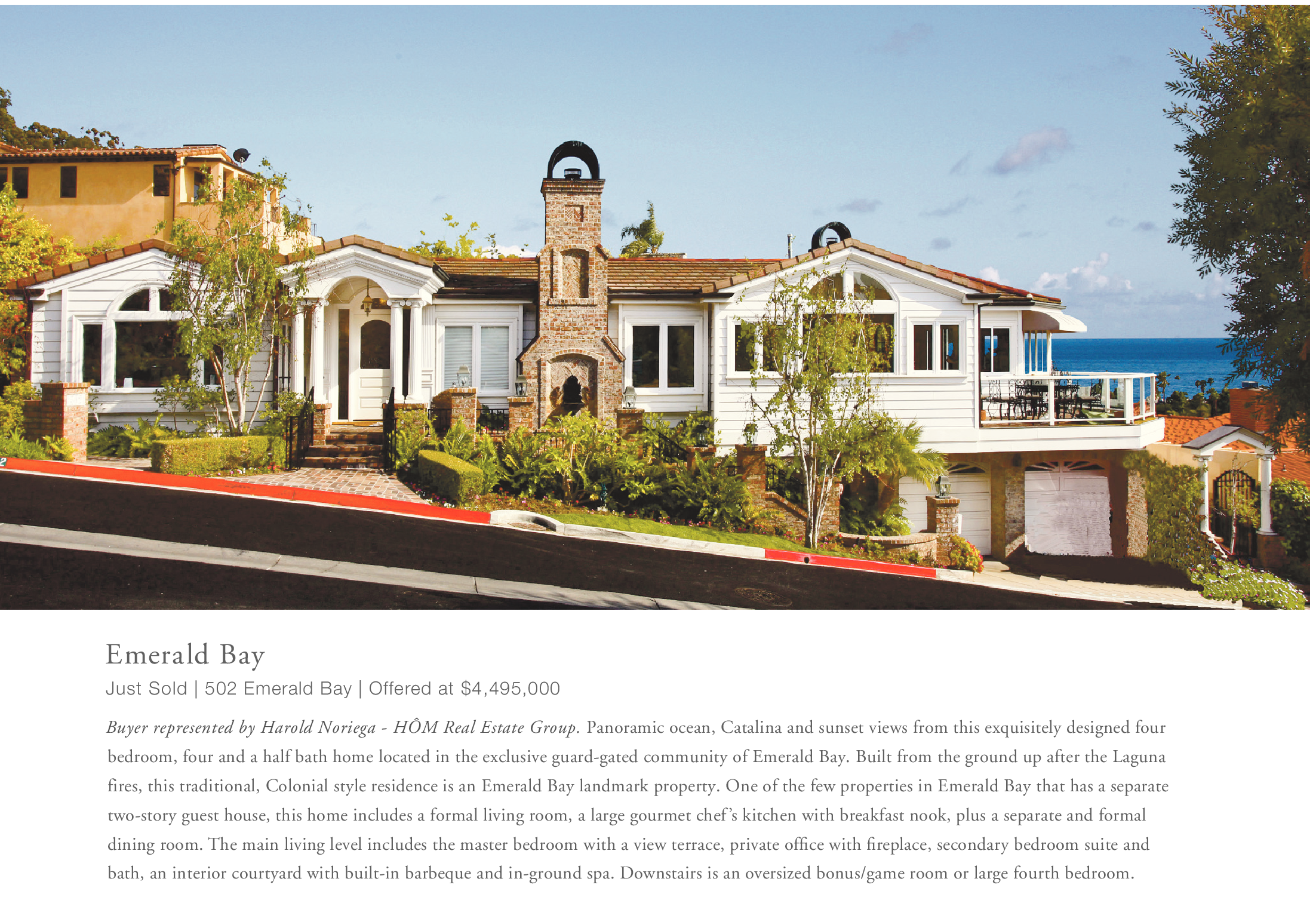 Emerald Bay Just Sold | 502 Emerald Bay | Offered at $4,495,000 Buyer represented by Harold Noriega - HÔM Real Estate Group. Panoramic ocean, Catalina and sunset views from this exquisitely designed four bedroom, four and a half bath home located in the exclusive guard-gated community of Emerald Bay. Built from the ground up after the Laguna fires, this traditional, Colonial style residence is an Emerald Bay landmark property. One of the few properties in Emerald Bay that has a separate two-story guest house, this home includes a formal living room, a large gourmet chef’s kitchen with breakfast nook, plus a separate and formal dining room. The main living level includes the master bedroom with a view terrace, private office with fireplace, secondary bedroom suite and bath, an interior courtyard with built-in barbeque and in-ground spa. Downstairs is an oversized bonus/game room or large fourth bedroom.