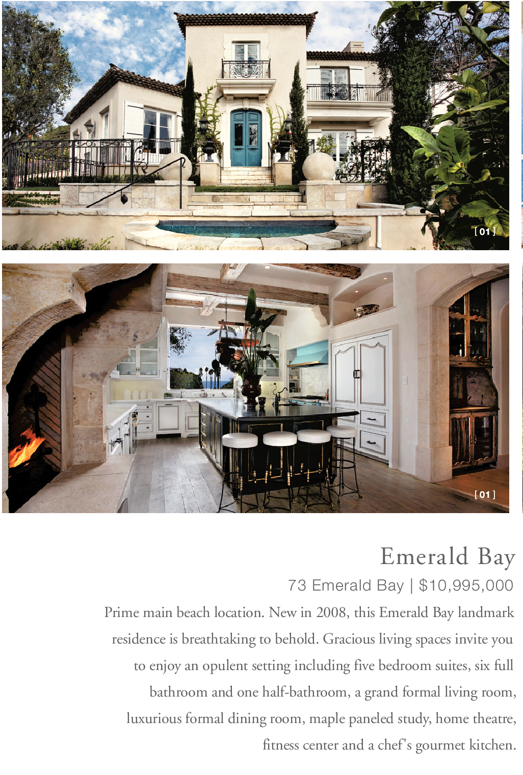 73 Emerald Bay | $10,995,000 Prime main beach location. New in 2008, this Emerald Bay landmark residence is breathtaking to behold. Gracious living spaces invite you to enjoy an opulent setting including five bedroom suites, six full bathroom and one half-bathroom, a grand formal living room, luxurious formal dining room, maple paneled study, home theatre, fitness center and a chef's gourmet kitchen.