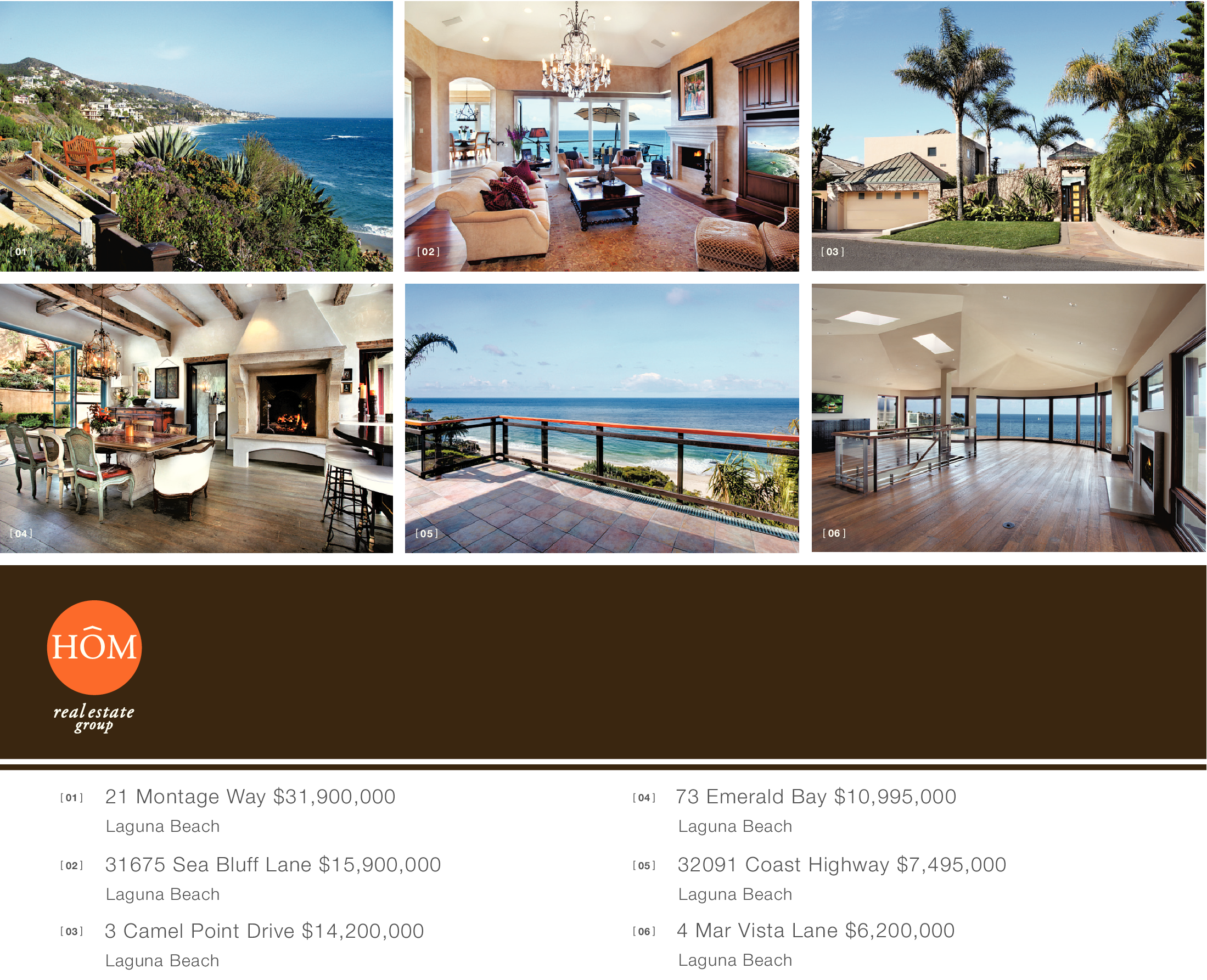 [ 01 ] [ 02 ] [ 03 ] [ 04 ] [ 05 ] [ 06 ] [ 01 ] [ 02 ] [ 03 ] 21 Montage Way $31,900,000 Laguna Beach 31675 Sea Bluff Lane $15,900,000 Laguna Beach 3 Camel Point Drive $14,200,000 Laguna Beach 73 Emerald Bay $10,995,000 Laguna Beach [ 04 ] [ 05 ] [ 06 ] 32091 Coast Highway $7,495,000 Laguna Beach 4 Mar Vista Lane $6,200,000 Laguna Beach
