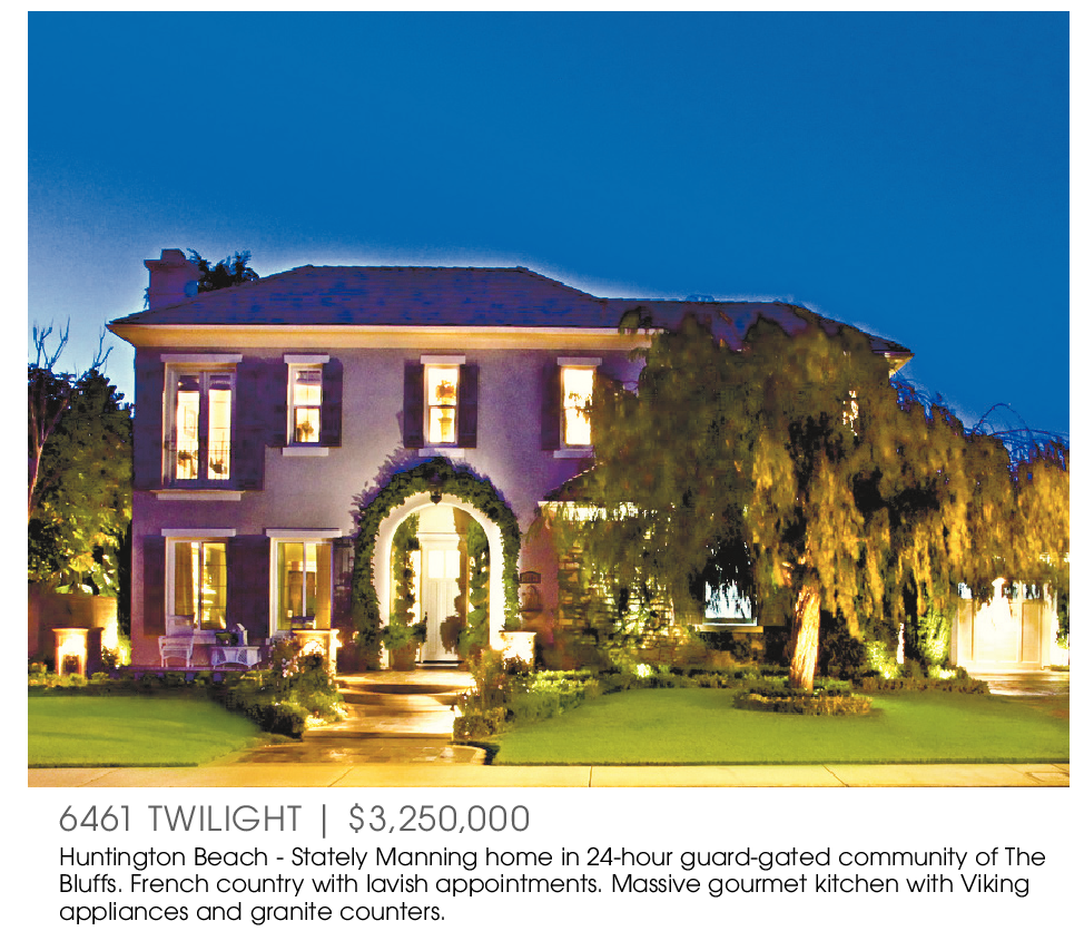 6461 TWILIGHT | $3,250,000 Huntington Beach - Stately Manning home in 24-hour guard-gated community of The Bluffs. French country with lavish appointments. Massive gourmet kitchen with Viking appliances and granite counters.