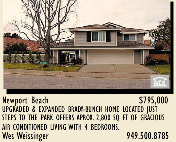 Newport Beach $795,000 UPGRADED & EXPANDED BRADY-BUNCH HOME LOCATED JUST STEPS TO THE PARK OFFERS APROX. 2,800 SQ FT OF GRACIOUS AIR CONDITIONED LIVING WITH 4 BEDROOMS. Wes Weissinger 949.500.8785