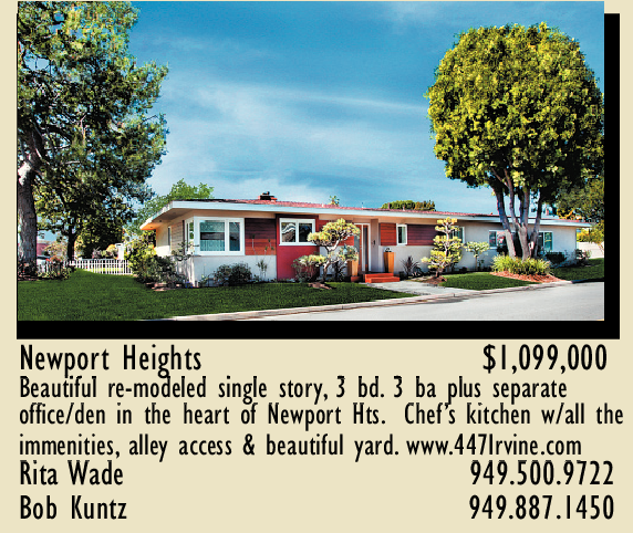 Newport Heights $1,099,000 Beautiful re-modeled single story, 3 bd. 3 ba plus separate office/den in the heart of Newport Hts. Chef’s kitchen w/all the immenities, alley access & beautiful yard. www.447Irvine.com Rita Wade 949.500.9722 Bob Kuntz 949.887.1450