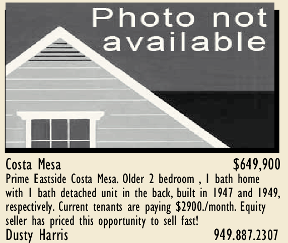 Costa Mesa $649,900 Prime Eastside Costa Mesa. Older 2 bedroom , 1 bath home with 1 bath detached unit in the back, built in 1947 and 1949, respectively. Current tenants are paying $2900./month. Equity seller has priced this opportunity to sell fast! Dusty Harris 949.887.2307
