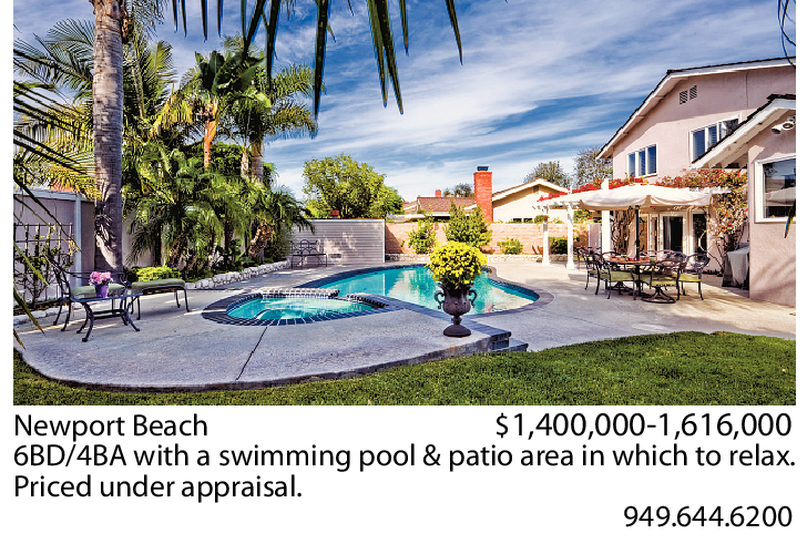 Newport Beach $1,400,000-1,616,000 6BD/4BA with a swimming pool & patio area in which to relax. Priced under appraisal.