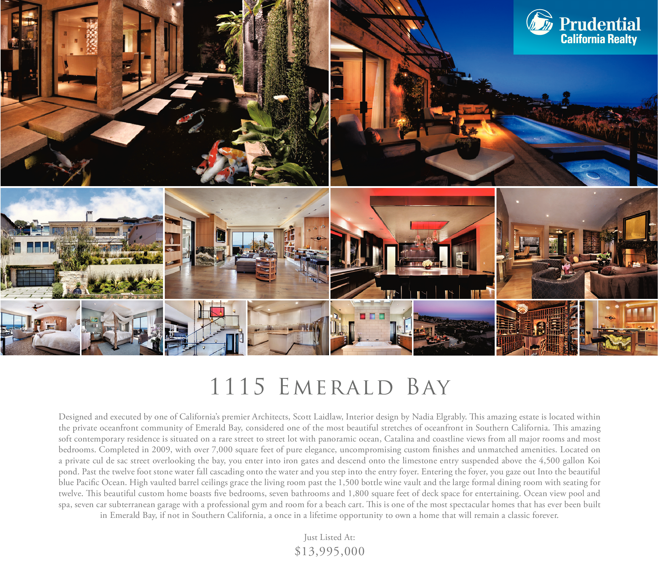 1 1 1 5 E m e r a l d B ay Designed and executed by one of California’s premier Architects, Scott Laidlaw, Interior design by Nadia Elgrably. This amazing estate is located within the private oceanfront community of Emerald Bay, considered one of the most beautiful stretches of oceanfront in Southern California. This amazing soft contemporary residence is situated on a rare street to street lot with panoramic ocean, Catalina and coastline views from all major rooms and most bedrooms. Completed in 2009, with over 7,000 square feet of pure elegance, uncompromising custom finishes and unmatched amenities. Located on a private cul de sac street overlooking the bay, you enter into iron gates and descend onto the limestone entry suspended above the 4,500 gallon Koi pond. Past the twelve foot stone water fall cascading onto the water and you step into the entry foyer. Entering the foyer, you gaze out Into the beautiful blue Pacific Ocean. High vaulted barrel ceilings grace the living room past the 1,500 bottle wine vault and the large formal dining room with seating for twelve. This beautiful custom home boasts five bedrooms, seven bathrooms and 1,800 square feet of deck space for entertaining. Ocean view pool and spa, seven car subterranean garage with a professional gym and room for a beach cart. This is one of the most spectacular homes that has ever been built in Emerald Bay, if not in Southern California, a once in a lifetime opportunity to own a home that will remain a classic forever. Just Listed At: $13,995,000