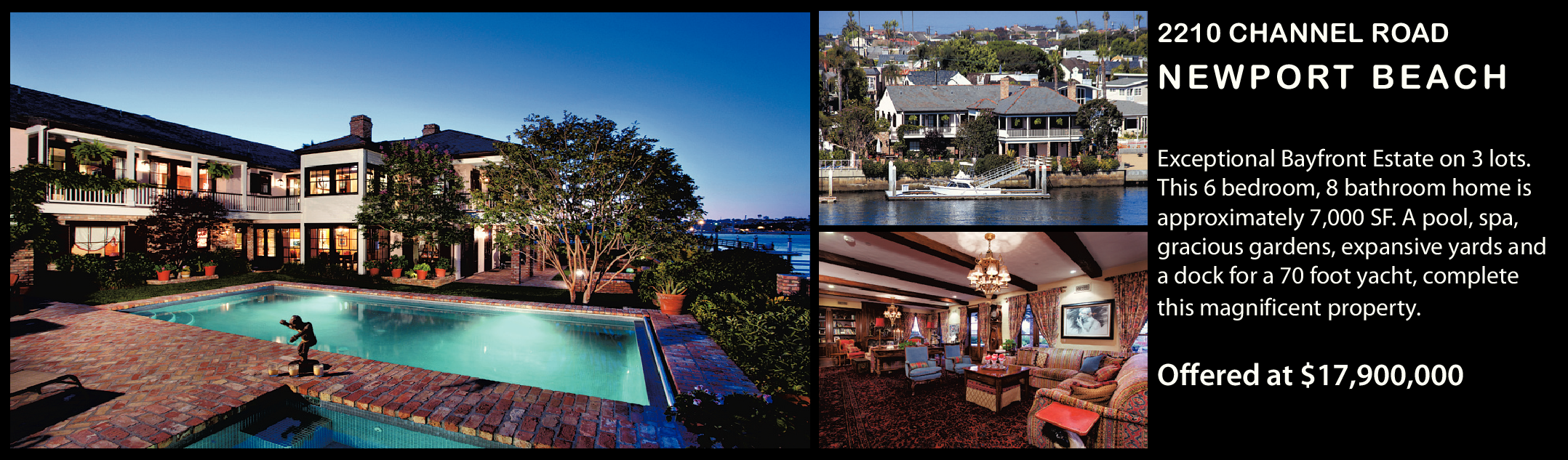 2210 CHANNEL ROAD NEWPORT BEACH Exceptional Bayfront Estate on 3 lots. This 6 bedroom, 8 bathroom home is approximately 7,000 SF. A pool, spa, gracious gardens, expansive yards and a dock for a 70 foot yacht, complete this magnificent property. Offered at $17,900,000
