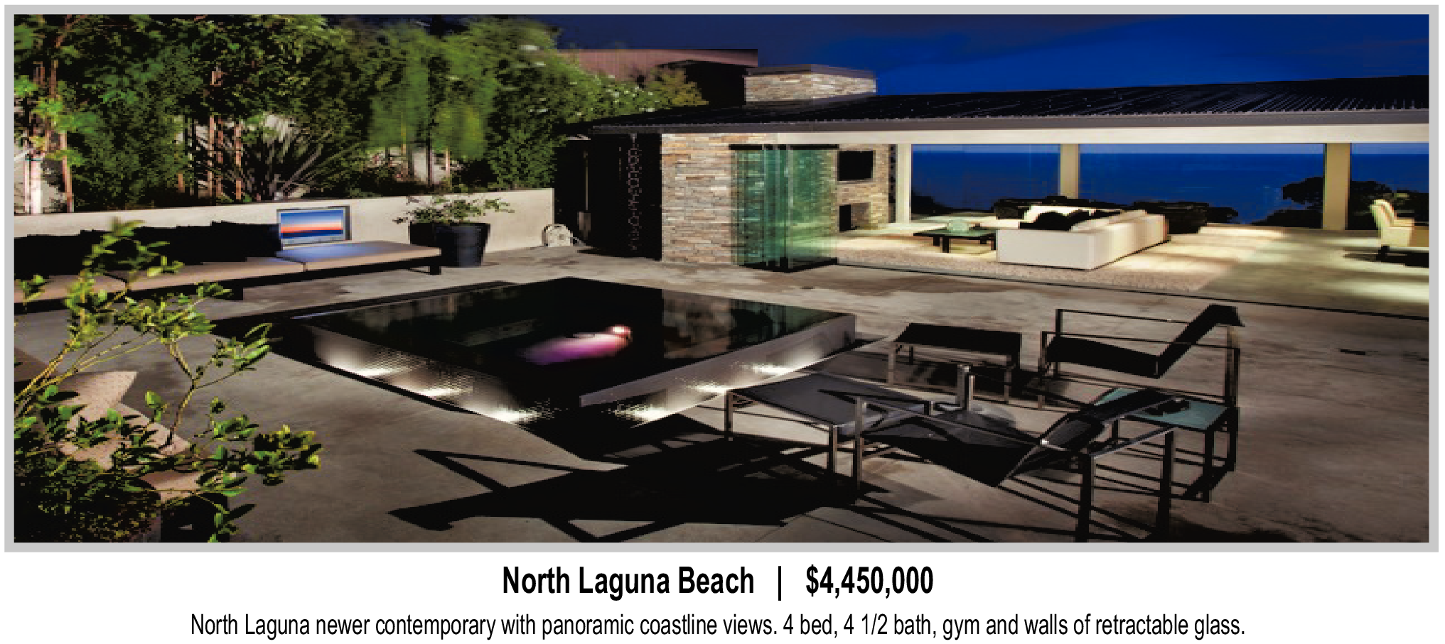 North Laguna newer contemporary with panoramic coastline views. 4 bed, 4 1/2 bath, gym and walls of retractable glass.