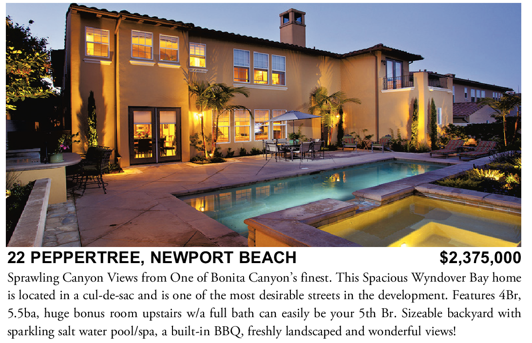 22 PEPPERTREE, NEWPORT BEACH $2,375,000 Sprawling Canyon Views from One of Bonita Canyon’s finest. This Spacious Wyndover Bay home is located in a cul-de-sac and is one of the most desirable streets in the development. Features 4Br, 5.5ba, huge bonus room upstairs w/a full bath can easily be your 5th Br. Sizeable backyard with sparkling salt water pool/spa, a built-in BBQ, freshly landscaped and wonderful views!