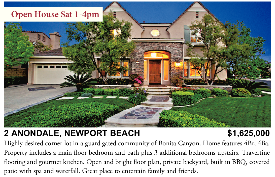 2 ANONDALE, NEWPORT BEACH $1,625,000 Highly desired corner lot in a guard gated community of Bonita Canyon. Home features 4Br, 4Ba. Property includes a main floor bedroom and bath plus 3 additional bedrooms upstairs. Travertine flooring and gourmet kitchen. Open and bright floor plan, private backyard, built in BBQ, covered patio with spa and waterfall. Great place to entertain family and friends.