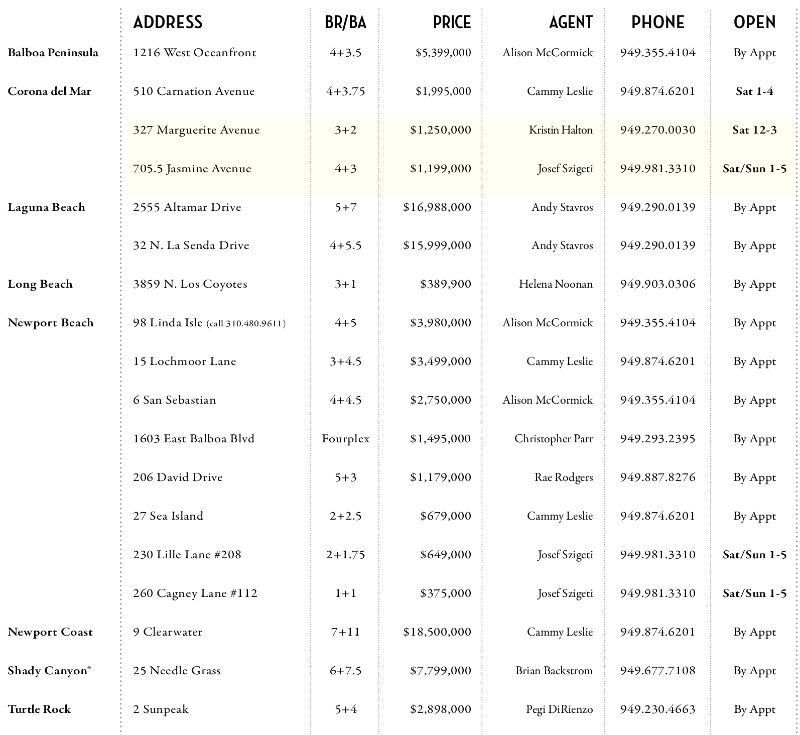 Newport Beach 98 Linda Isle (call 310.480.9611) 4+5 $3,980,000 Alison McCormick 949.355.4104 By Appt