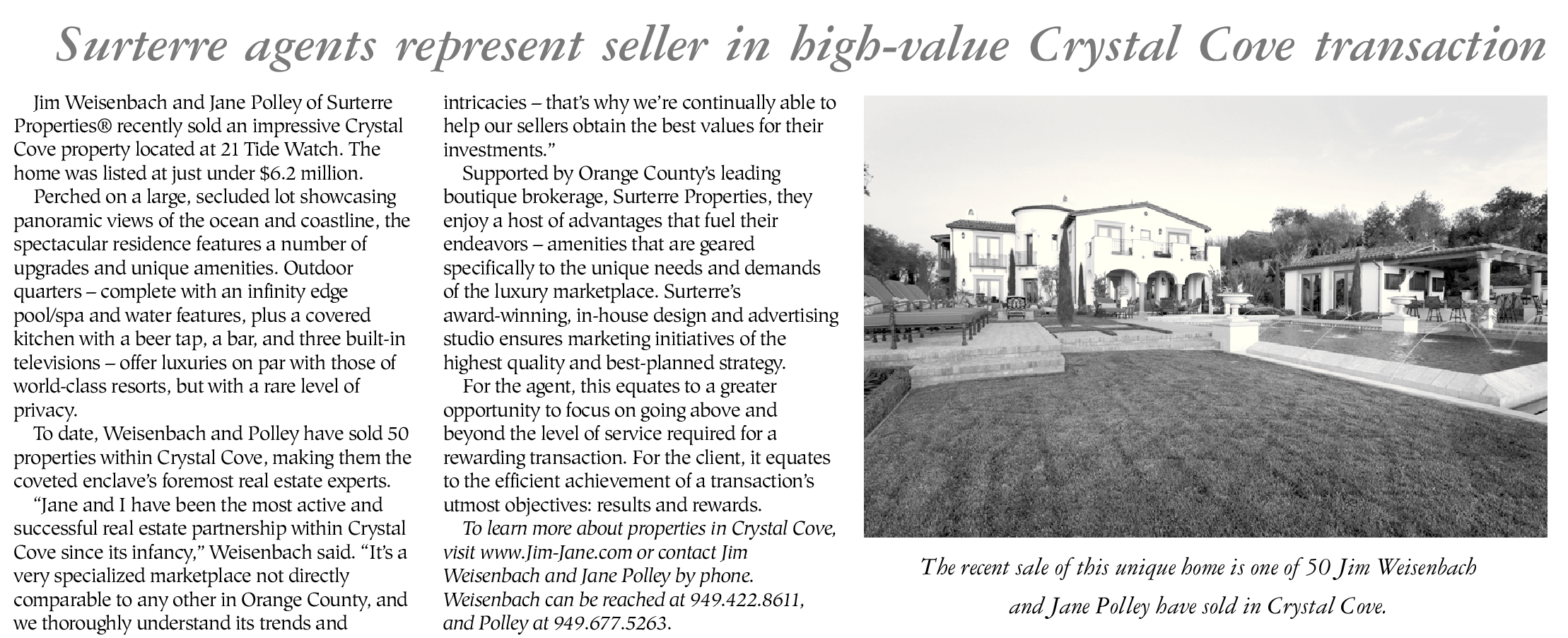 Jim Weisenbach and Jane Polley of Surterre Properties® recently sold an impressive Crystal Cove property located at 21 Tide Watch. The home was listed at just under $6.2 million.
