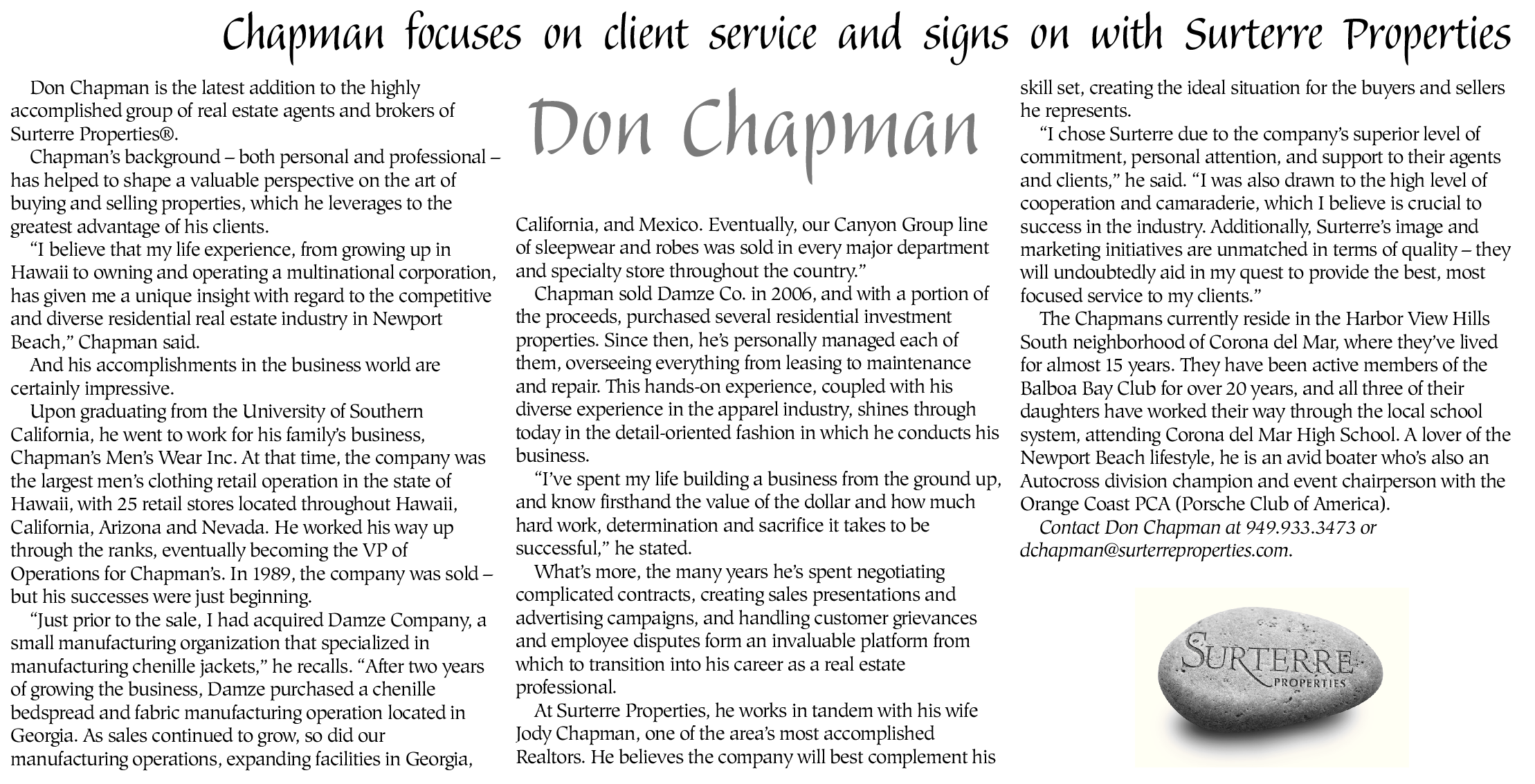 “I believe that my life experience, from growing up in Hawaii to owning and operating a multinational corporation, has given me a unique insight with regard to the competitive and diverse residential real estate industry in Newport Beach,” Chapman said.