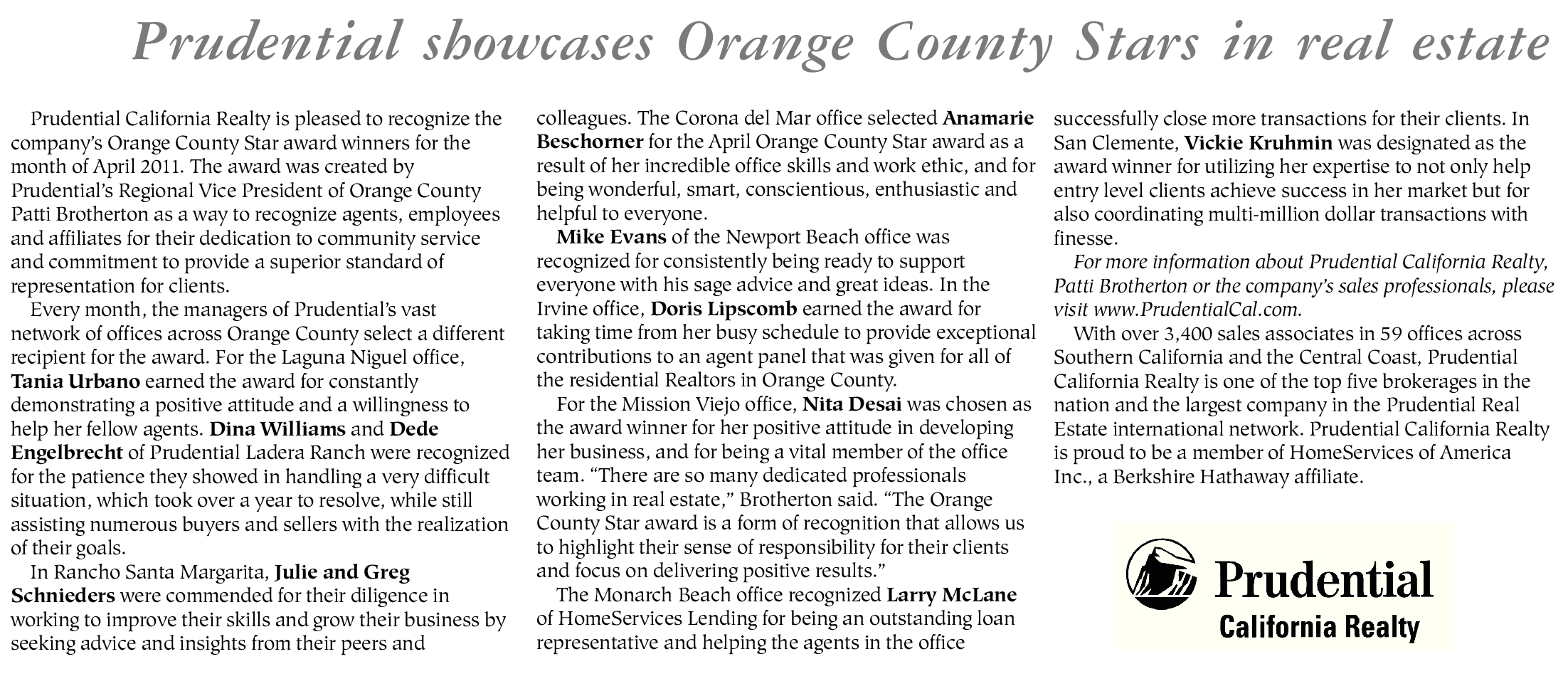 Prudential California Realty is pleased to recognize the company’s Orange County Star award winners for the month of April 2011. The award was created by Prudential’s Regional Vice President of Orange County Patti Brotherton as a way to recognize agents, employees and affiliates for their dedication to community service and commitment to provide a superior standard of representation for clients.