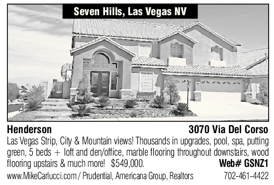Seven Hills, Las Vegas NV Henderson 3070 Via Del Corso Las Vegas Strip, City & Mountain views! Thousands in upgrades, pool, spa, putting green, 5 beds + loft and den/office, marble flooring throughout downstairs, wood flooring upstairs & much more! $549,000. Web# GSNZ1 www.MikeCarlucci.com / Prudential, Americana Group, Realtors 702-461-4422