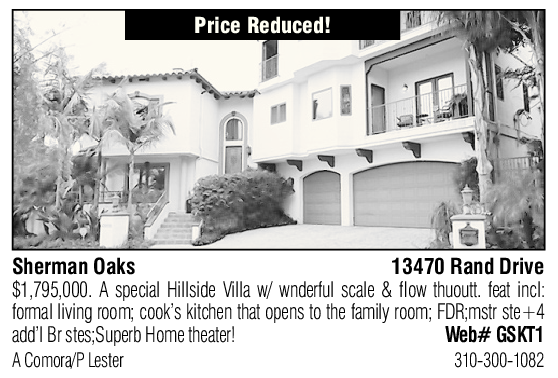 Sherman Oaks 13470 Rand Drive $1,795,000. A special Hillside Villa w/ wnderful scale & flow thuoutt. feat incl: formal living room; cook’s kitchen that opens to the family room; FDR;mstr ste+4 add’l Br stes;Superb Home theater! Web# GSKT1 A Comora/P Lester 310-300-1082