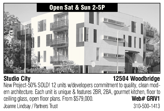 Studio City 12504 Woodbridge New Project-50% SOLD! 12 units w/developers commitment to quality, clean modern architecture. Each unit is unique & features 2BR, 2BA, gourmet kitchen, floor to ceiling glass, open floor plans. From $579,000. Web# GRIV1 Joanne Lindsay / Partners Trust 310-500-1413