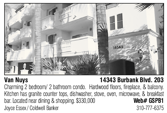 Van Nuys 14343 Burbank Blvd. 203 Charming 2 bedroom/ 2 bathroom condo. Hardwood floors, fireplace, & balcony. Kitchen has granite counter tops, dishwasher, stove, oven, microwave, & breakfast bar. Located near dining & shopping. $330,000 Web# GSPB1 Joyce Essex / Coldwell Banker 310-777-6375
