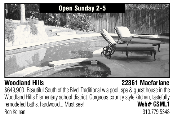 Open Sunday 2-5 Woodland Hills 22361 Macfarlane $649,900. Beautiful South of the Blvd Traditional w a pool, spa & guest house in the Woodland Hills Elementary school district. Gorgeous country style kitchen, tastefully remodeled baths, hardwood... Must see! Web# GSML1 Ron Keinan 310.779.5348 See also