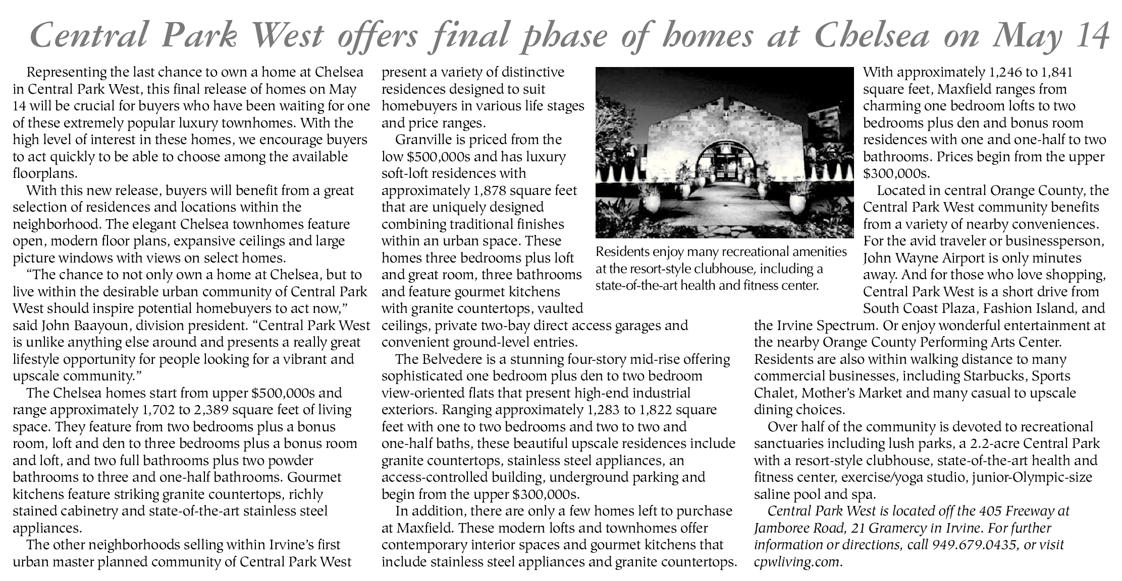 Central Park West is located off the 405 Freeway at Jamboree Road, 21 Gramercy in Irvine. For further information or directions, call 949.679.0435, or visit cpwliving.com.