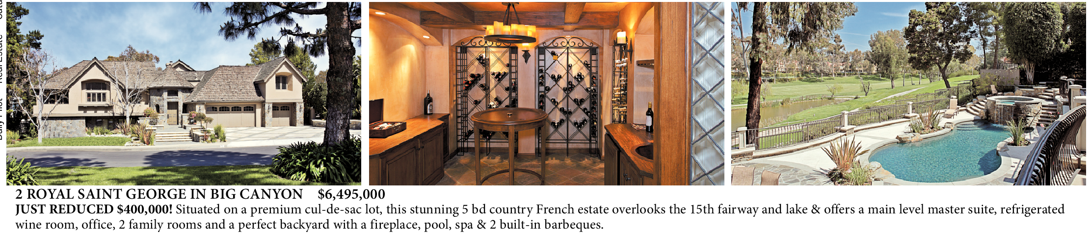 2 ROYAL SAINT GEORGE IN BIG CANYON $6,495,000 JUST REDUCED $400,000! Situated on a premium cul-de-sac lot, this stunning 5 bd country French estate overlooks the 15th fairway and lake & offers a main level master suite, refrigerated wine room, office, 2 family rooms and a perfect backyard with a fireplace, pool, spa & 2 built-in barbeques.