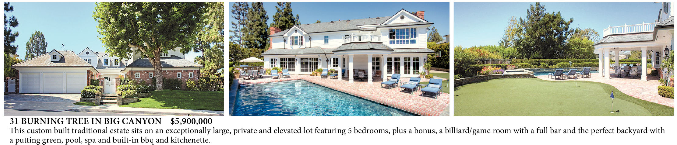 31 BURNING TREE IN BIG CANYON $5,900,000 This custom built traditional estate sits on an exceptionally large, private and elevated lot featuring 5 bedrooms, plus a bonus, a billiard/game room with a full bar and the perfect backyard with a putting green, pool, spa and built-in bbq and kitchenette.
