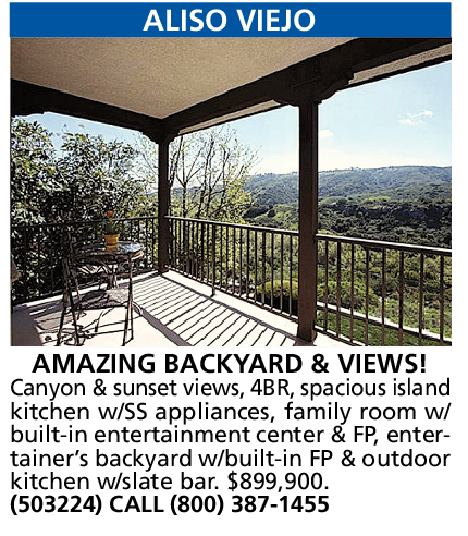 Canyon & sunset views, 4BR, spacious island kitchen w/SS appliances, family room w/ built-in entertainment center & FP, entertainer’s backyard w/built-in FP & outdoor kitchen w/slate bar. $899,900. (503224) CALL (800) 387-1455
