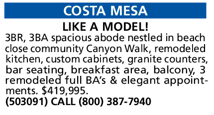 3BR, 3BA spacious abode nestled in beach close community Canyon Walk, remodeled kitchen, custom cabinets, granite counters, bar seating, breakfast area, balcony, 3 remodeled full BA’s & elegant appointments. $419,995.