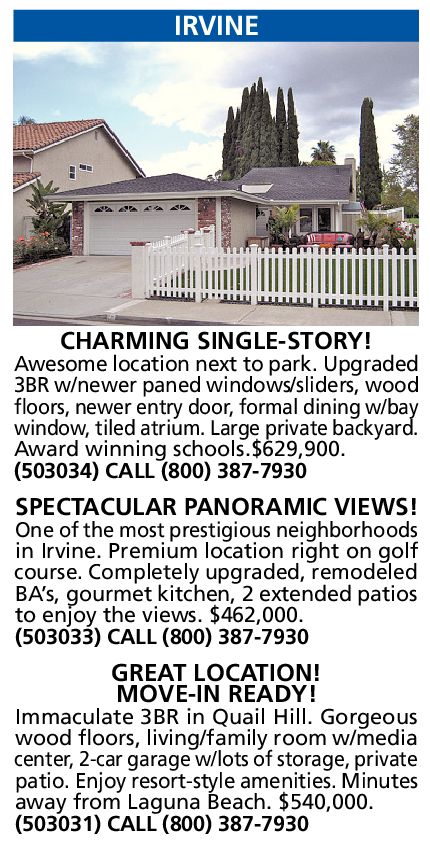 Awesome location next to park. Upgraded 3BR w/newer paned windows/sliders, wood floors, newer entry door, formal dining w/bay window, tiled atrium. Large private backyard. Award winning schools.$629,900. (503034) CALL (800) 387-7930 SPECTACULAR PANORAMIC VIEWS! One of the most prestigious neighborhoods in Irvine. Premium location right on golf course. Completely upgraded, remodeled BA’s, gourmet kitchen, 2 extended patios to enjoy the views. $462,000. (503033) CALL (800) 387-7930 GREAT LOCATION!