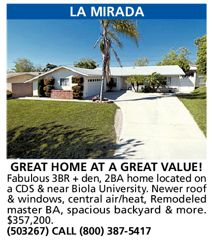 Fabulous 3BR + den, 2BA home located on a CDS & near Biola University. Newer roof & windows, central air/heat, Remodeled master BA, spacious backyard & more. $357,200. (503267) CALL (800) 387-5417