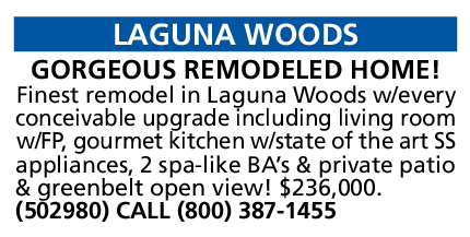 Finest remodel in Laguna Woods w/every conceivable upgrade including living room w/FP, gourmet kitchen w/state of the art SS appliances, 2 spa-like BA’s & private patio & greenbelt open view! $236,000. (502980) CALL (800) 387-1455