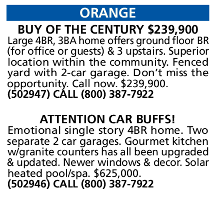 ORANGE BUY OF THE CENTURY $239,900 Large 4BR, 3BA home offers ground floor BR (for office or guests) & 3 upstairs. Superior location within the community. Fenced yard with 2-car garage. Don’t miss the opportunity. Call now. $239,900. (502947) CALL (800) 387-7922 ATTENTION CAR BUFFS! Emotional single story 4BR home. Two separate 2 car garages. Gourmet kitchen w/granite counters has all been upgraded & updated. Newer windows & decor. Solar heated pool/spa. $625,000. (502946) CALL (800) 387-7922