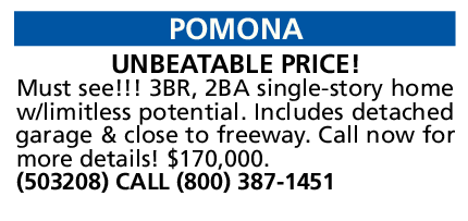 Must see!!! 3BR, 2BA single-story home w/limitless potential. Includes detached garage & close to freeway. Call now for more details! $170,000. (503208) CALL (800) 387-1451