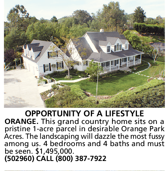 OPPORTUNITY OF A LIFESTYLE ORANGE. This grand country home sits on a pristine 1-acre parcel in desirable Orange Park Acres. The landscaping will dazzle the most fussy among us. 4 bedrooms and 4 baths and must be seen. $1,495,000. (502960) CALL (800) 387-7922