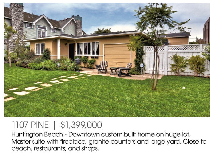 1107 PINE | $1,399,000 Huntington Beach - Downtown custom built home on huge lot. Master suite with fireplace, granite counters and large yard. Close to beach, restaurants, and shops.