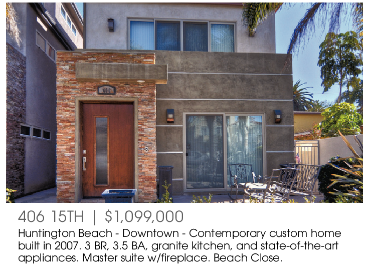 406 15TH | $1,099,000 Huntington Beach - Downtown - Contemporary custom home built in 2007. 3 BR, 3.5 BA, granite kitchen, and state-of-the-art appliances. Master suite w/fireplace. Beach Close.