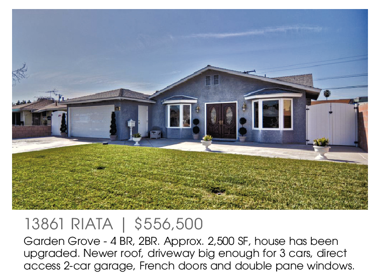 13861 RIATA | $556,500 Garden Grove - 4 BR, 2BR. Approx. 2,500 SF, house has been upgraded. Newer roof, driveway big enough for 3 cars, direct access 2-car garage, French doors and double pane windows.