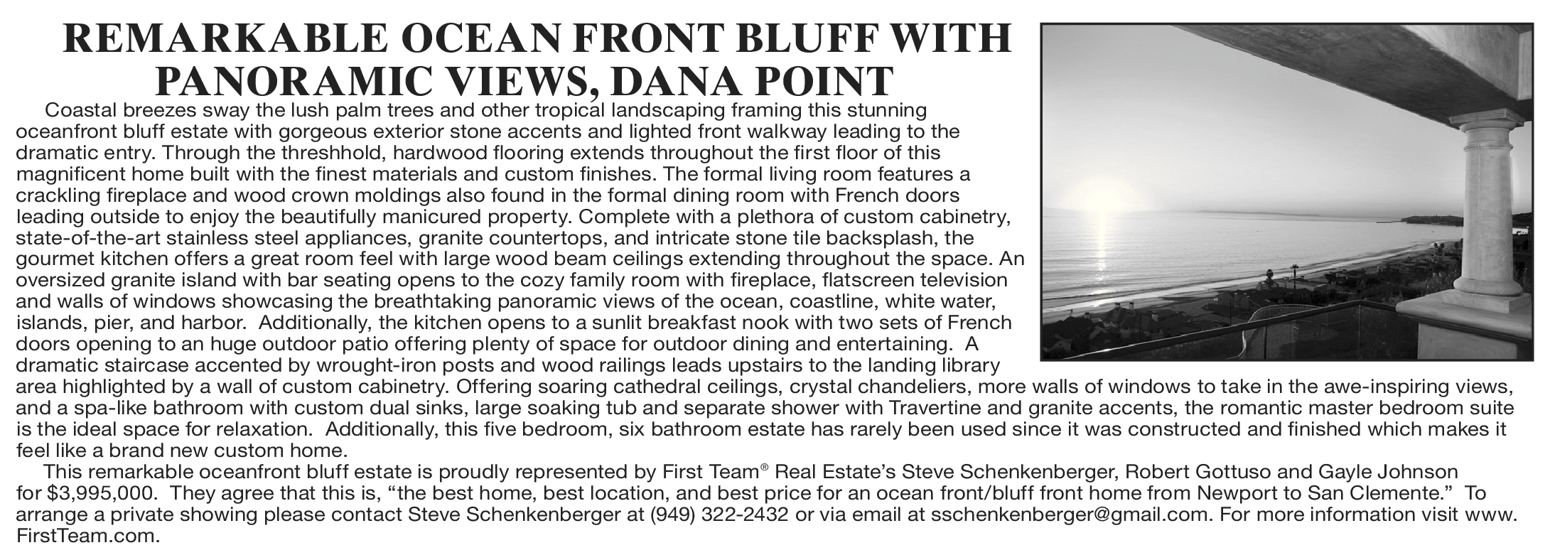 REMARKABLE OCEAN FRONT BLUFF WITH PANORAMIC VIEWS, DANA POINT Coastal breezes sway the lush palm trees and other tropical landscaping framing this stunning oceanfront bluff estate with gorgeous exterior stone accents and lighted front walkway leading to the dramatic entry. Through the threshhold, hardwood flooring extends throughout the first floor of this magnificent home built with the finest materials and custom finishes. The formal living room features a crackling fireplace and wood crown moldings also found in the formal dining room with French doors leading outside to enjoy the beautifully manicured property. Complete with a plethora of custom cabinetry, state-of-the-art stainless steel appliances, granite countertops, and intricate stone tile backsplash, the gourmet kitchen offers a great room feel with large wood beam ceilings extending throughout the space. An oversized granite island with bar seating opens to the cozy family room with fireplace, flatscreen television and walls of windows showcasing the breathtaking panoramic views of the ocean, coastline, white water, islands, pier, and harbor. Additionally, the kitchen opens to a sunlit breakfast nook with two sets of French doors opening to an huge outdoor patio offering plenty of space for outdoor dining and entertaining. A dramatic staircase accented by wrought-iron posts and wood railings leads upstairs to the landing library area highlighted by a wall of custom cabinetry. Offering soaring cathedral ceilings, crystal chandeliers, more walls of windows to take in the awe-inspiring views, and a spa-like bathroom with custom dual sinks, large soaking tub and separate shower with Travertine and granite accents, the romantic master bedroom suite is the ideal space for relaxation. Additionally, this five bedroom, six bathroom estate has rarely been used since it was constructed and finished which makes it feel like a brand new custom home. This remarkable oceanfront bluff estate is proudly represented by First Team ® Real Estate’s Steve Schenkenberger, Robert Gottuso and Gayle Johnson for $3,995,000. They agree that this is, “the best home, best location, and best price for an ocean front/bluff front home from Newport to San Clemente.” To arrange a private showing please contact Steve Schenkenberger at (949) 322-2432 or via email at sschenkenberger@gmail.com. For more information visit www. FirstTeam.com.
