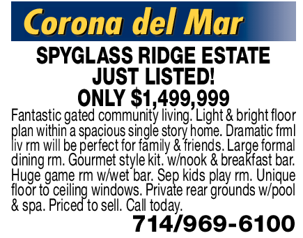 Corona del Mar SPYGLASS RIDGE ESTATE JUST LISTED! ONLY $1,499,999 Fantastic gated community living. Light & bright floor plan within a spacious single story home. Dramatic frml liv rm will be perfect for family & friends. Large formal dining rm. Gourmet style kit. w/nook & breakfast bar. Huge game rm w/wet bar. Sep kids play rm. Unique floor to ceiling windows. Private rear grounds w/pool & spa. Priced to sell. Call today. 714/969-6100